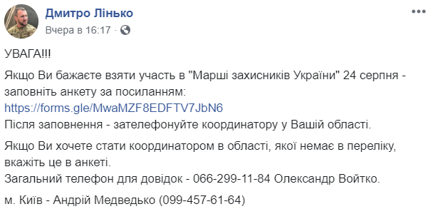 Линько в Facebook указывает, что координатором в целом по маршу является Александр Войтко – активный участник С14. А по Киеву – Андрей Медведько, также "сичевик", которого подозревают в убийстве Олеся Бузины.