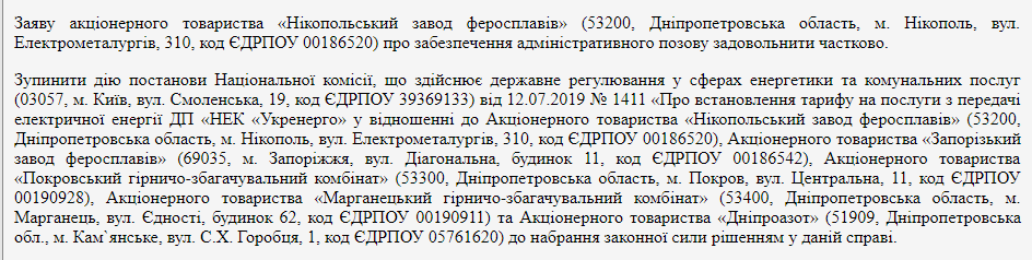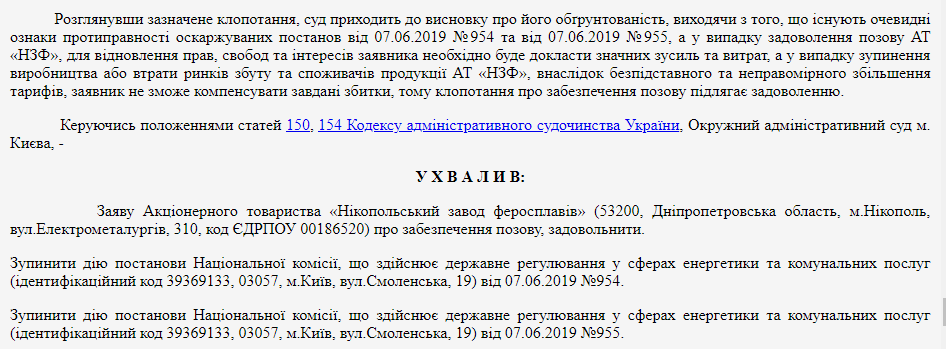 В итоге суд внял доводам никопольского завода и остановил действие спорных постановлений НКРЭКУ. При этом суд указал, что существуют "очевидные признаки противоправности" этих постановлений: