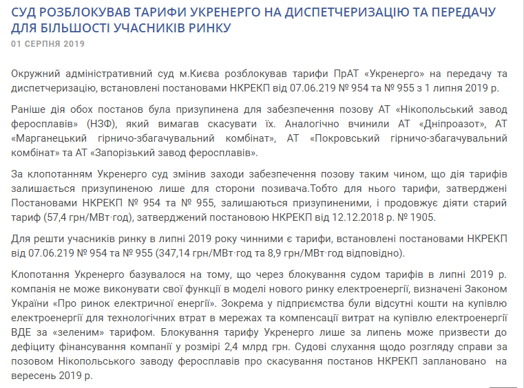 Никопольский завод добился в окружном административном суде Киева остановки действия постановлений НКРЕ № 954 и 955, которыми были введены новые тарифы в пользу "Укрэнерго".