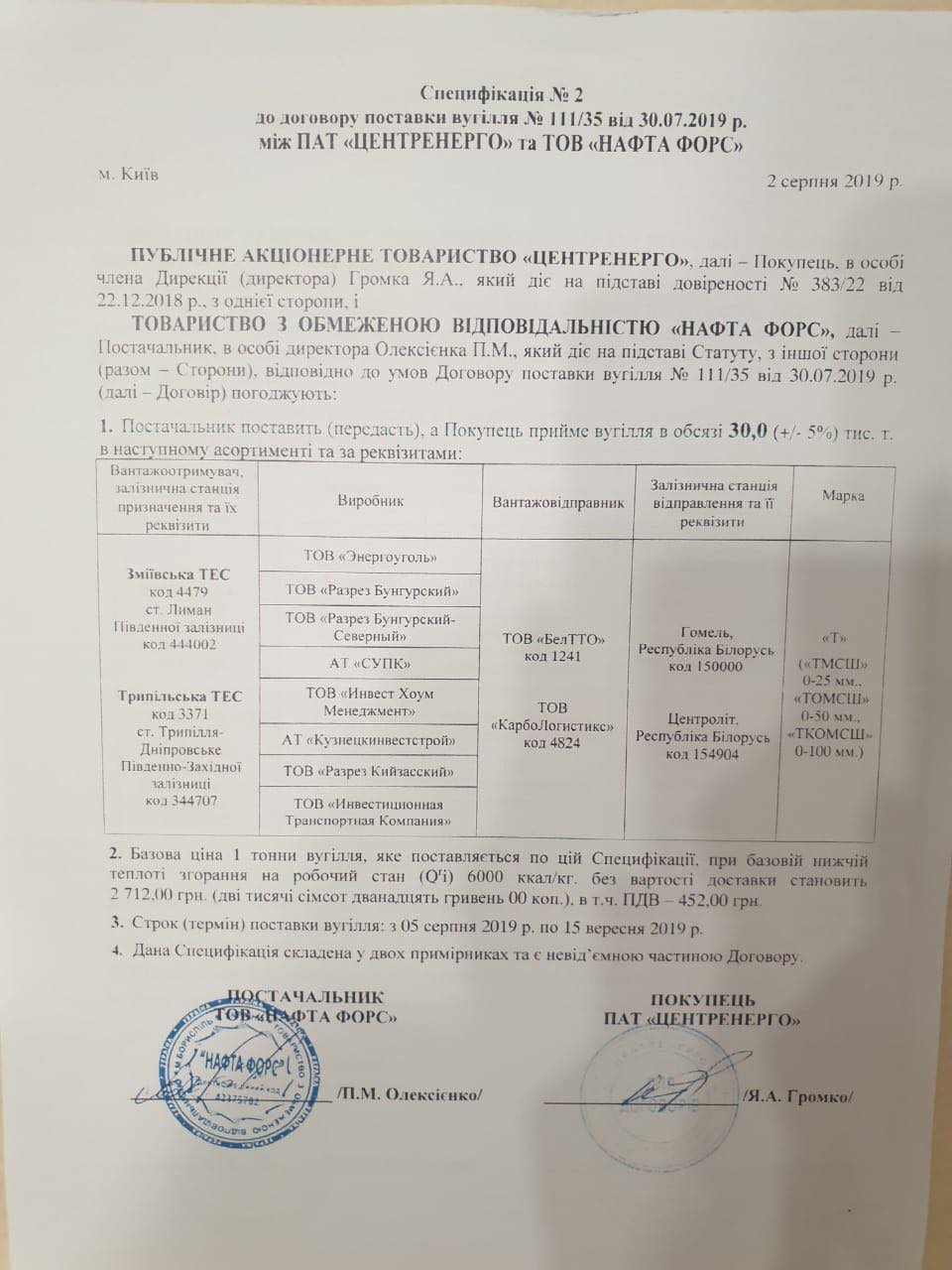 Есть также спецификация на 50 тысяч тонн угля от этого же поставщика по 2574 гривни за тонну.