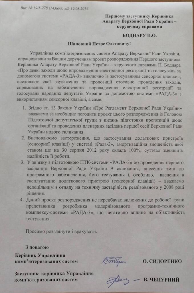 Чиновник пояснил, что 22 августа сообщил на допросе в ГБР о действиях "коллег" по работе в парламенте, направленных на осуществление преступления в части внедрения "инициативы Парубия". И повторил ранее озвученные им аргументы о том, что гарантийные сроки обслуживания так и не введенного "сенсора" в зале голосований парламента вышли.