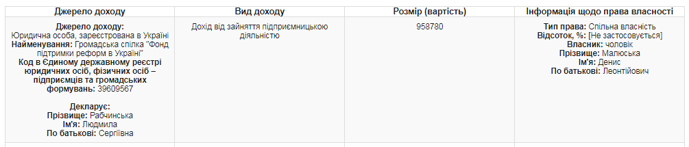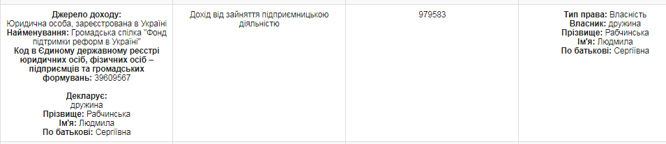В ней Людмила Рабчинская сообщила, что ее супруг Денис Малюська получил почти миллион (959 000) гривен в качестве предпринимательского дохода от общественной организации "Фонд поддержки реформ в Украине":