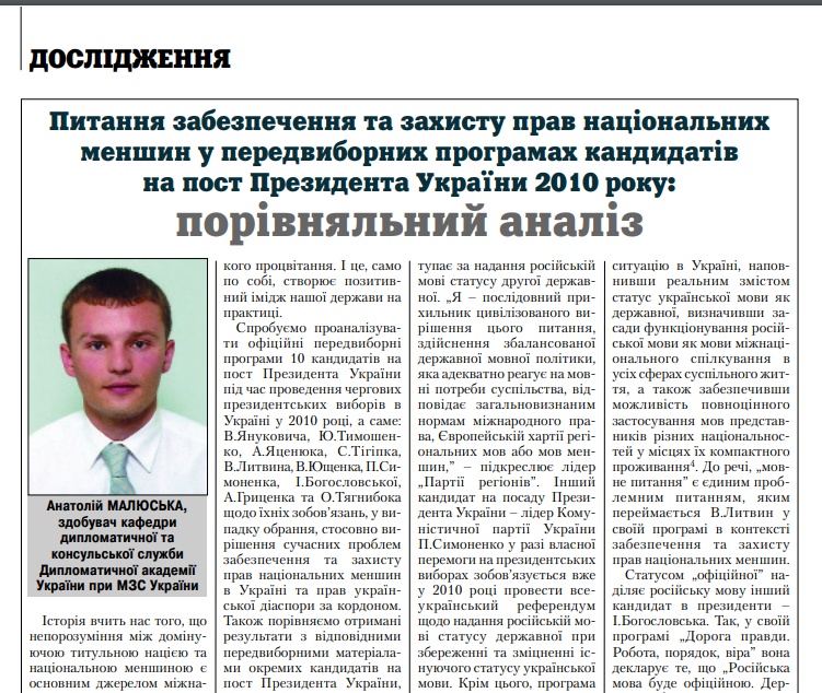 Интересно, что в 2009 году в журнале "Внешние отношения" (укр. "Зовнішні справи") брат министра Анатолий Малюська опубликовал исследование программ кандидатов в президенты на тему обеспечения прав национальных меньшинств: