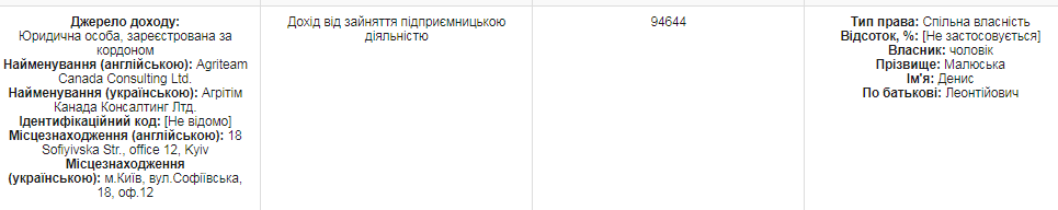Еще одним источником доходов нового министра с супругой были деньги канадской компании "Agriteam Canada Consulting Ltd". В 2017 году, согласно декларации супруги министра, Денис Малюська получил от нее почти 95 000 грн в качестве предпринимательского дохода: