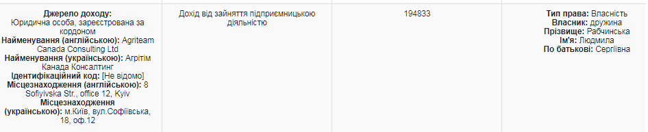 В 2018 году почти 195 000 грн. от той же канадской фирмы получила уже супруга министра, и тоже в виде предпринимательского дохода: