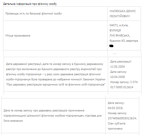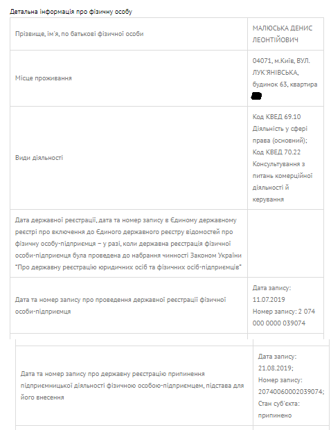 Второй раз Денис Малюська зарегистрировался предпринимателем 11 июля 2019 года, перед парламентскими выборами. А после избрания нардепом 21 августа он снова закрыл свою предпринимательскую деятельность: