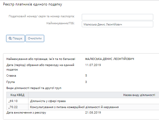 Однако во время второго периода пребывания в статусе предпринимателя Денис Малюська успел стать плательщиком единого налога по ставке 5%, о чем свидетельствуют данные соответствующего реестра: