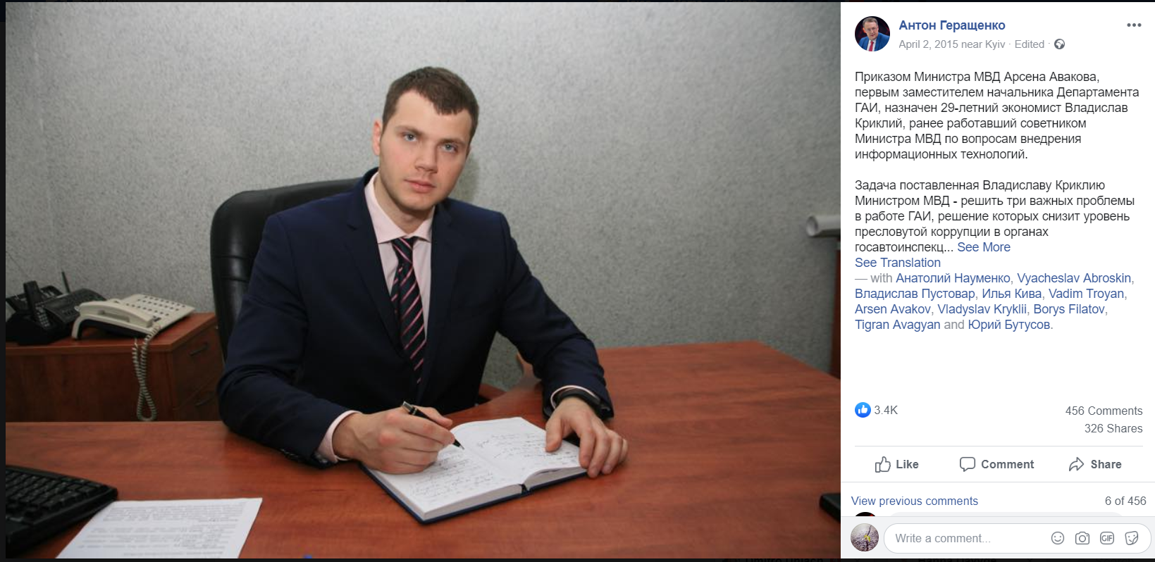 "Страна" рассказывала, что 32-летний Криклий был близок к Арсену Авакову: в 2014 году он стал советником министра внутренних дел.