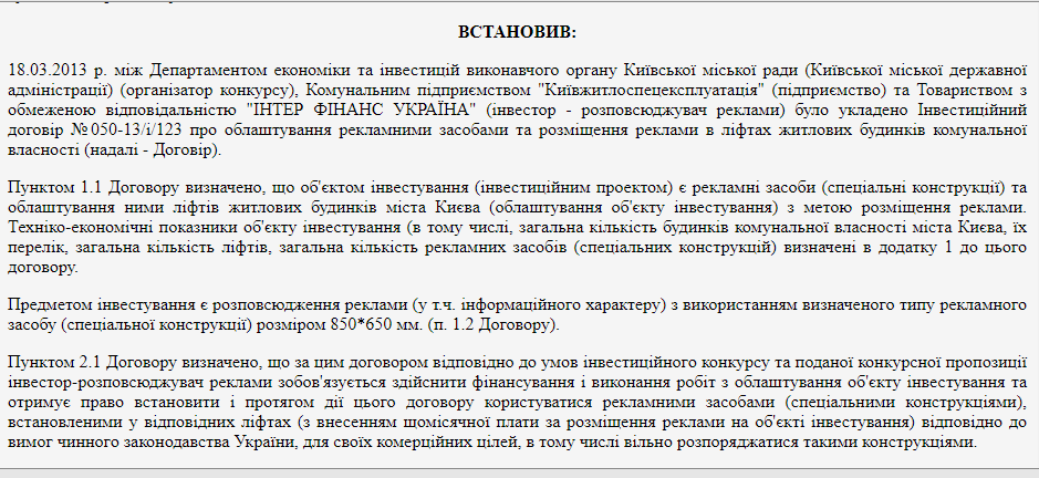 Данная фирма засветилась в марте 2013 года, когда заключила договор с киевским коммунальным предприятием "Киевжилспецэксплуатация" о размещении рекламы в лифтах жилых домов. По нему фирма должна была ежемесячно платить городу почти 345 тысяч гривен.