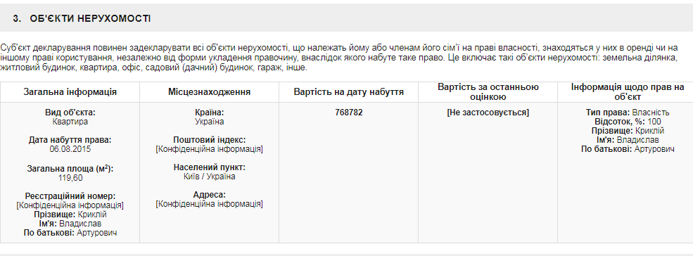 В итоге в декларации за 2015 год Владислав Криклий был вынужден показать наличие этой квартиры. Она была оформлена в его собственность в августе 2015 года, стоимость жилья была показана в сумме почти 769 тысяч грн.