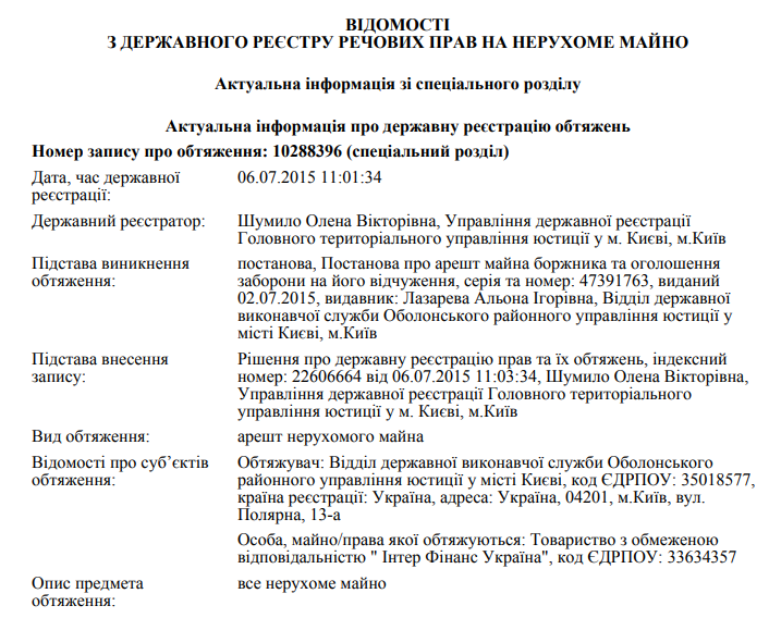 Летом 2015 года исполнительная служба арестовала все имущество фирмы. Об этом свидетельствуют данные реестра недвижимости, которые получила "Страна". Поскольку арест до сих пор еще не снят, погасить свой долг фирма, видимо, не смогла.