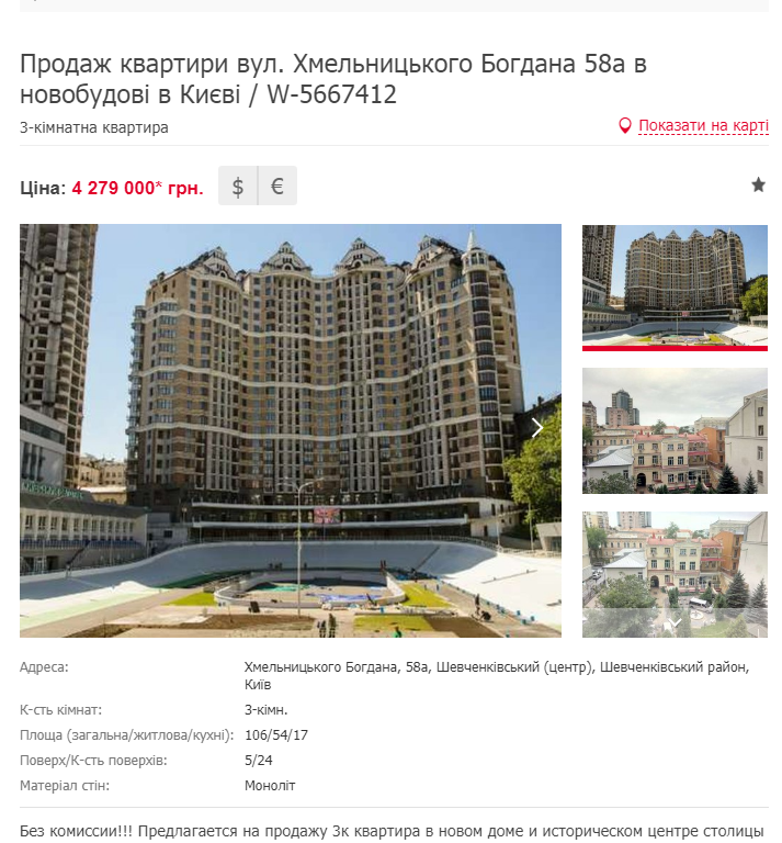 Проблема в том, что на самом деле цена такой квартиры в разы больше. На одном из сайтов недвижимости квартира в этом доме даже с меньшей площадью продается за 4,3 млн грн, это эквивалент 175 тыс. дол.
