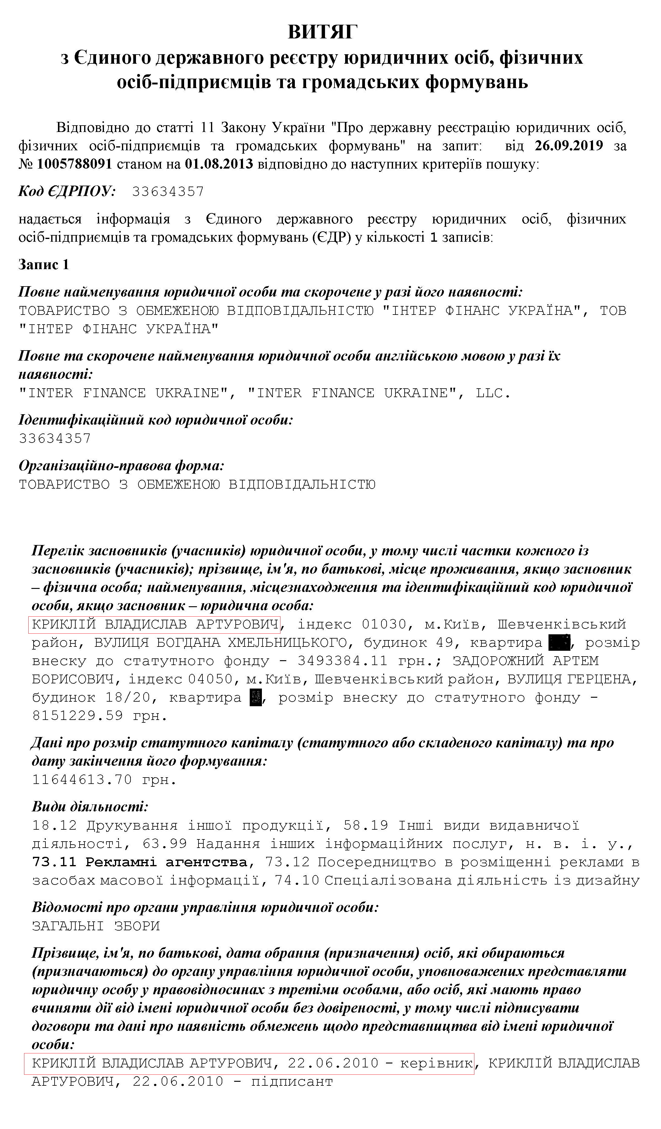 Директором фирмы "Интер финанс Украина" с июня 2010-го по июнь 2014 года был Владислав Криклий. Он же был там учредителем с долей в 30%.