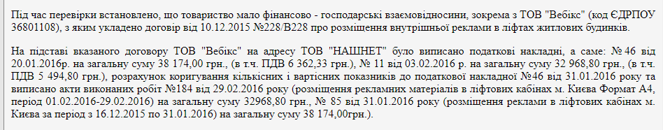 В решении суда сказано, что договор на размещение рекламы в лифтах фирма "Вебикс" заключила в декабре 2015 года – то есть после того, как договор с другим рекламным агентством Владислава Криклия "Интер финанс Украина" был разорван. По этому договору только от одного рекламодателя фирма "Вебикс" получила больше 30 тыс грн.
