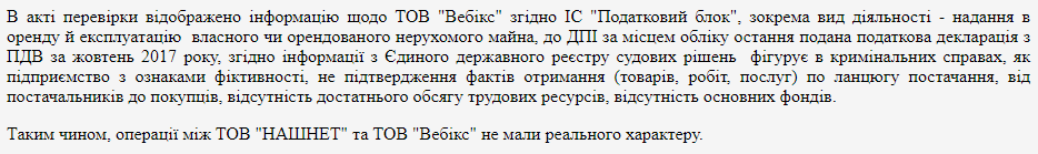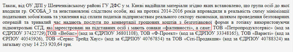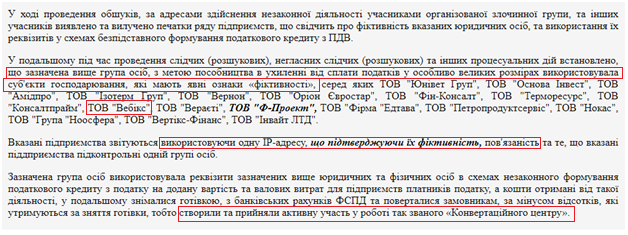 В определении Соломенского райсуда Киева по этому уголовному делу говорится, что организованная преступная группа из пяти человек, которая при посредничестве, вероятно, фиктивных компаний (среди которых была и фирма Криклия ООО "Вебикс") реализовывала схемы незаконного формирования налогового кредита. Такая деятельность имела признаки "конвертационного центра".