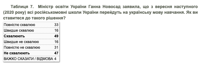 За доказательствами того, что языковой вопрос раскалывает общество, и ходить далеко не надо. Буквально накануне Киевский международный институт социологии обнародовал результаты опроса, где 49% одобряют переход русскоязычных школ на украинский язык, а 47% не одобряют. С учетом статистической погрешности исследования можно говорить, что голоса разделились пополам.