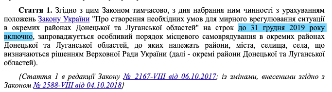 Этот закон предусматривает особый порядок для неподконтрольных Киеву территорий, границы которых определены Минскими соглашениями.