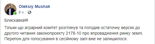 “Большой Брат приказал не баловаться и продать землю. Никаких постатейных обсуждений, смягчающих поправок или тем более референдумов. За новогодние каникулы будет собрана методом кнута и пряника (папки и конверта) необходимое количество голосов “папуасов”. После принятия в январе соответствующего закона страна заходит в глубокий политический кризис, и одной только отставкой правительства могут не обойтись”, - спрогнозировал на своей странице в Фейсбуке Игорь Попов, намекая, что голоса в зале будут собирать с помощью компромата на депутатов (то есть “папки”) и - банально покупая (деньгами в конвертах).