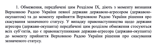 Но ограничения будут связаны не только с самим "государством-агрессором", но и в случае появления его "правопреемников". Очевидно, авторы закона считают, что за время действия закона Россия в нынешнем виде прекратит существование, а вместо нее появится какая-то другая страна - при чем тоже агрессор.