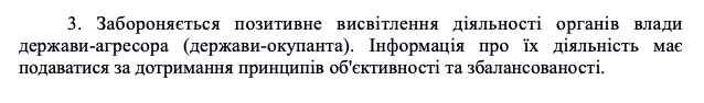 Отдельным пунктом упомянут запрет на любое положительное освещение деятельности органов власти государства-агрессора.