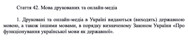 Напомним, с 16 мая 2022 года должны будут полностью украинизироваться интернет-СМИ, зарегистрированные в Украине. Страничка на украинском языке должна будет загружаться автоматически, а функцию чтения материалов на русском языке сделать дополнительной, по желанию. Странички СМИ в социальных медиа, например, в Facebook или Инстаграм, также переведут на украинский язык. Тоже самое касается мобильных приложений медиа. Эта норма не касается крымско-татарских СМИ, англоязычных и СМИ, которые выходят на официальных языках Евросоюза.