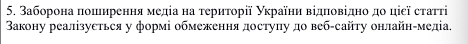 То есть, в случае, если сайт нарушит вышеупомянутые ограничения, Нацрада может обратиться в суд и по сокращенной процедуре (даже не вызывая представителей сайта на заседание) всего в течение 2 дней может быть вынесено решение о запрете распространения медиа на территории Украины - запрете Интернет-провайдерам предоставлять доступ пользователям сети Интернет к этому сайту.