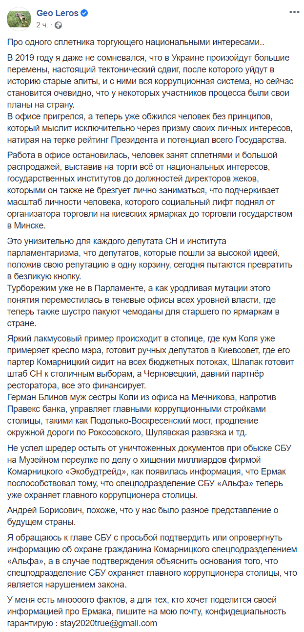 Член фракции Гео Лерос разразился гневным постом в Фейсбуке, в котором обвинил руководителя ОП в политиканстве, коррупции и сдачи национальных интересов.