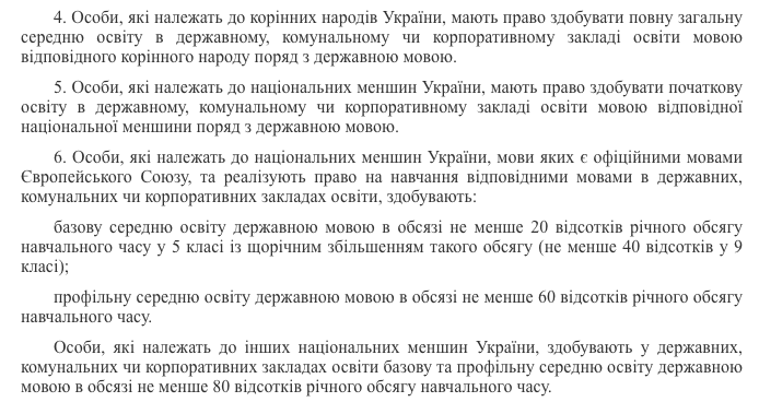 Они могут на материнском языке, наряду с изучением государственного, учиться в начальной школе. С 5 класса не менее 20% годового объема учебного времени должно преподаваться на украинском языке с постепенным увеличением, чтобы в 9 классе не менее 40% предметов преподавались на государственном языке. А в старшей школе не менее 60% годового объема учебного времени должно читаться на украинском.