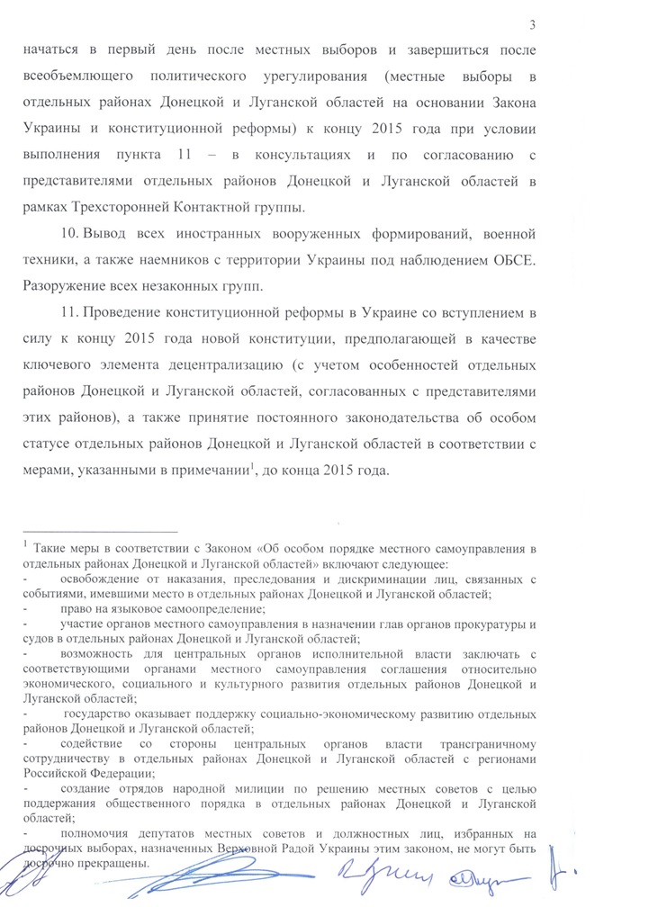В документе был уточнен и расширен список мероприятий, предусмотренных "Минском-1". Также в "Комплекс мер" была добавлена политическая часть. Она предусматривала особый статус отдельных районов Донбасса, проведение там выборов по украинским законам, амнистию участникам конфликта и т.д.