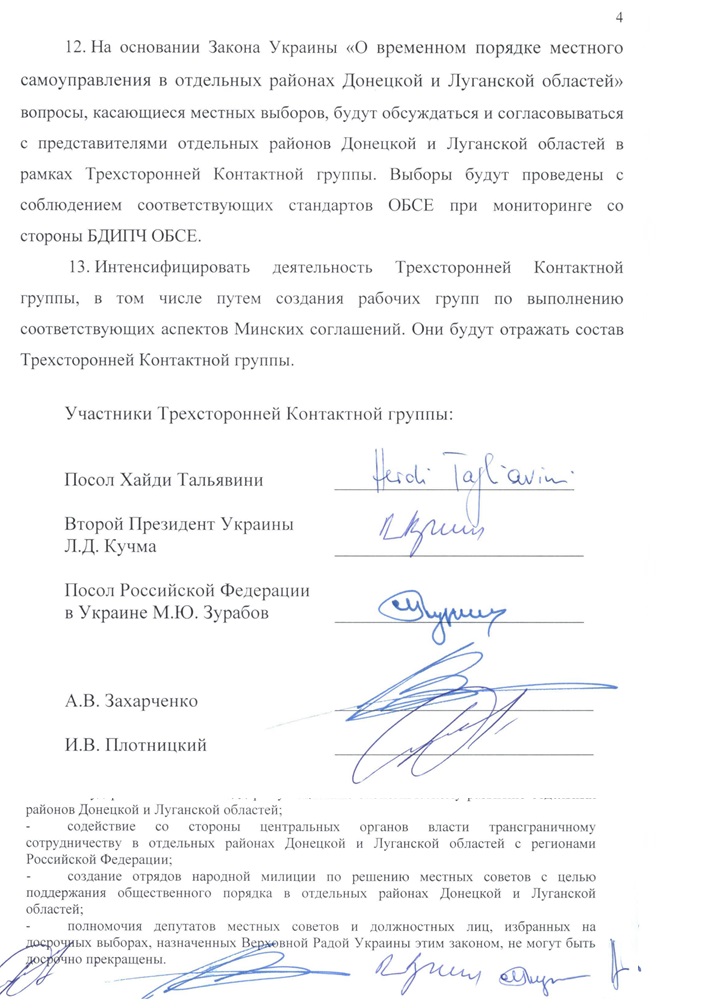 Меморандум подписали Посол ОБСЕ Хайди Тальявини, представитель Украины Леонид Кучма, посол России в Украине Михаил Зурабов и представители "ДНР" и "ЛНР" Александр Захарченко и Игорь Плотницкий.