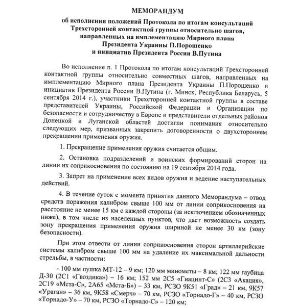 4. В течение суток с момента принятия данного меморандума отвод средств поражения калибром свыше 100 миллиметров от линии соприкосновения на расстояния не менее 15 километров с каждой стороны: