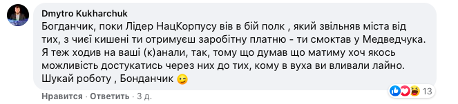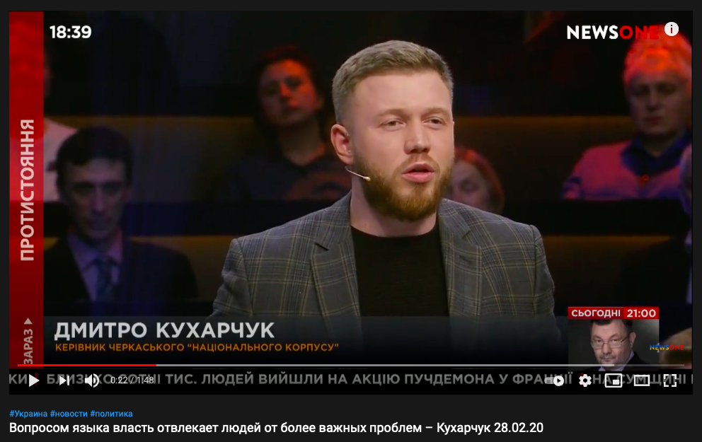 Руководитель черкасского "Национального корпуса" Дмитрий Кухарчук, соратник Андрея Билецкого (одного из героев первого текста "Страны" о "переобувшихся" политиках) также обвиняет закрытые телеканалы в пропаганде кремлевских тезисов и злорадствует над их блокировкой.