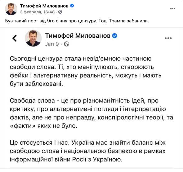 Однако когда все три телеканала заблокировали, Милованов скупо комментировал эту тему. Он процитировал свой собственный пост, который написал месяцем раньше, когда заблокировали Трампа. А тогда Милованов недвусмысленно высказался на тему возможности блокировки за манипуляции.