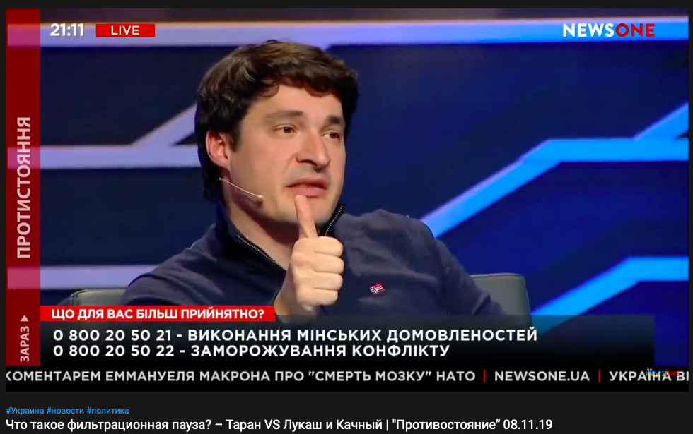 А вот тот же человек спокойно сидит в студии телеканалов, которые, по его словам, "транслируют медведчуковскую пропаганду". Но почему-то, когда он был на съемках, его это не смущало.