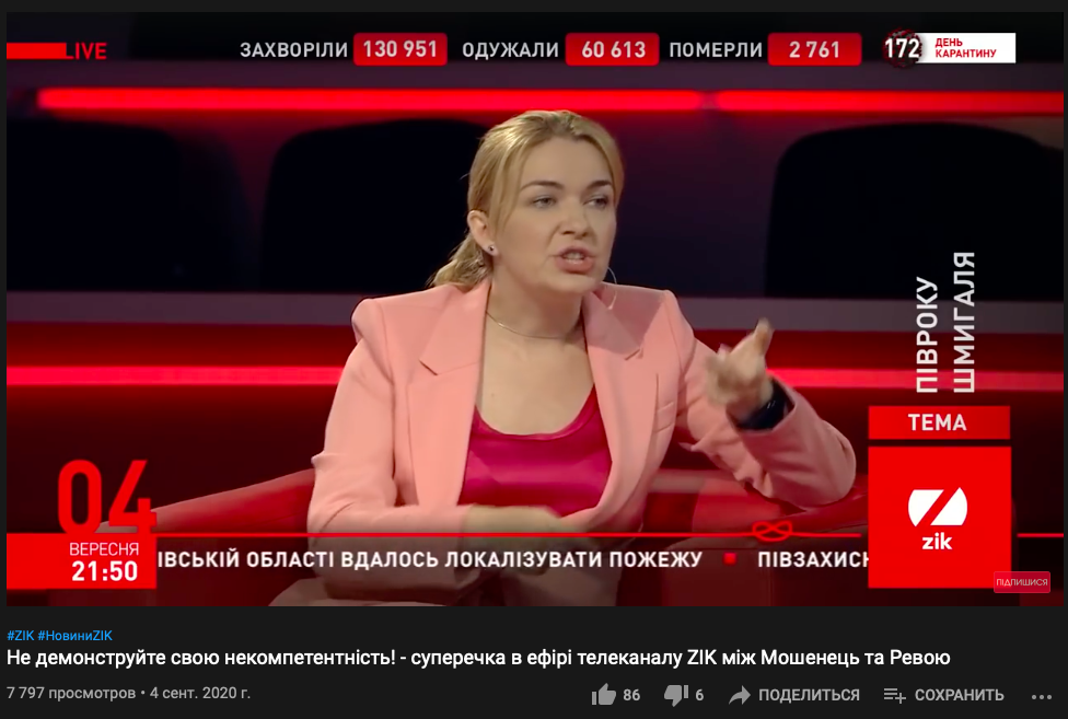 Хотя сама присутствовала на ток-шоу телеканала NewsOne всего три недели назад, и об этом не было ни слова. Неделю назад она была на ZIK, а в эфире "112" канала Мошенец выступала прямо в день блокировки - 2 февраля.
