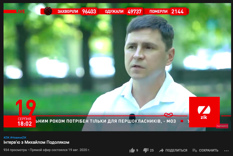 При этом Подоляк почему-то не упоминает о том, что не так давно сам "сидел в эфире" одного из каналов, которые теперь называет пророссийскими. Так, в августе 2020-го года Подоляк давал большое интервью телеканалу ZIK.