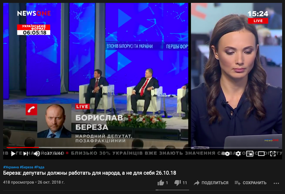 К примеру, 26 октября 2018 года. Береза дает комментарий телеканалу NewsOne, который за две недели до этого купил Тарас Козак. О совершении сделки Козак отчитался 12 октября 2018 года.