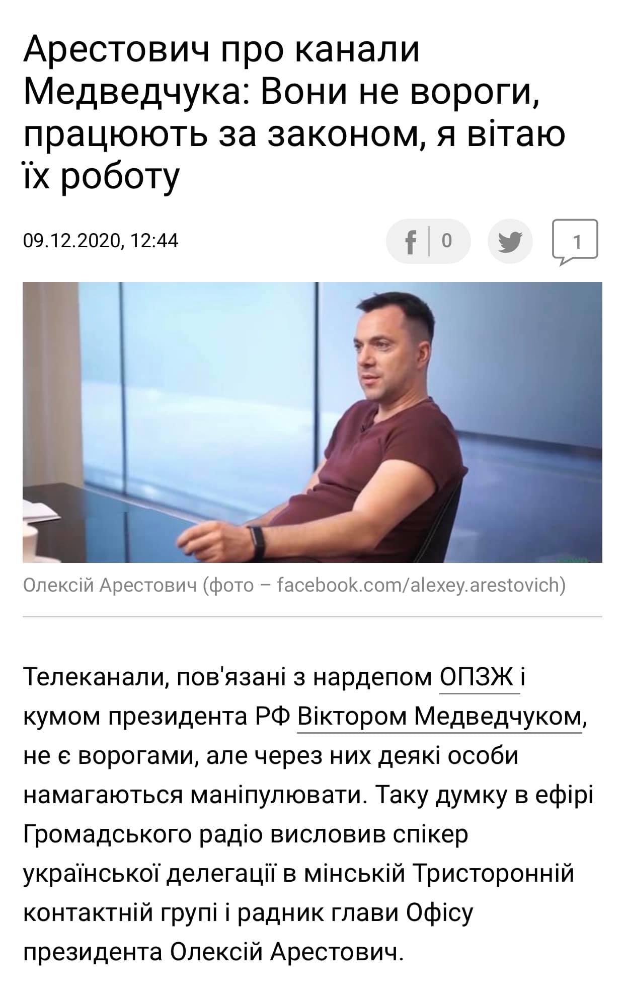 А самое интересное, что еще в декабре 2020-го года, то есть два месяца назад, Арестович заявлял, что "приветствует работу" каналов Медведчука. "Они не враги Украины, работают по закону".
