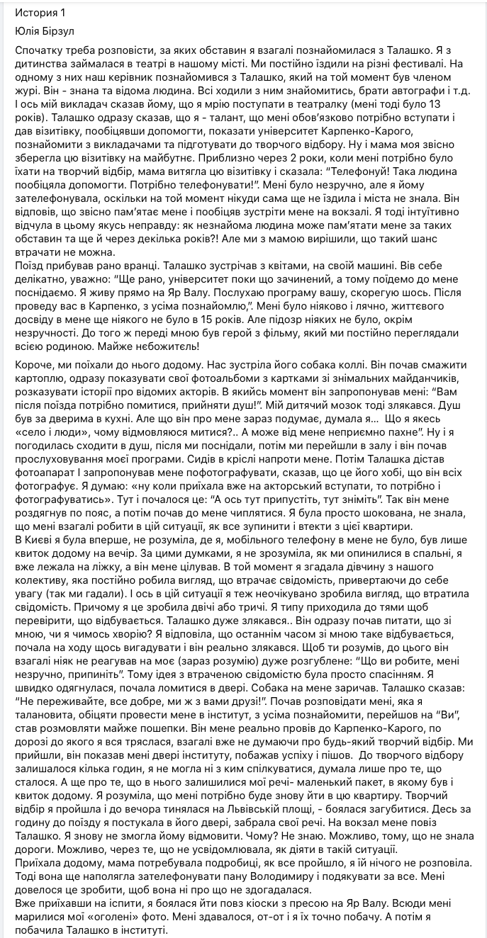 После обнародования первых двух историй о домогательствах Талашко с именами пострадавших девушек, публично высказались в их поддержку и другие выпускницы Карпенко-Карого.