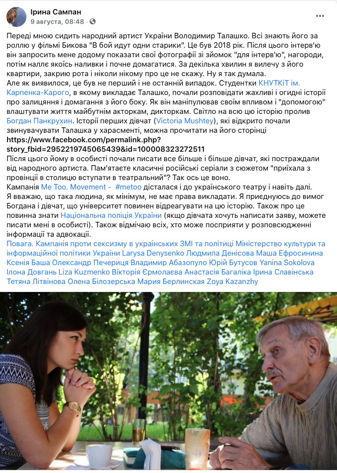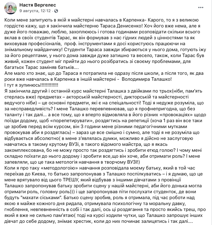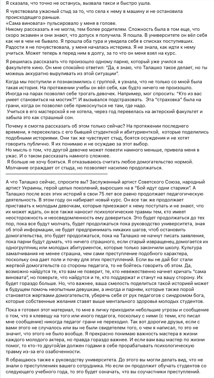 Летом студентки Карпенко-Какого, которым Талашко якобы "помогал" с поступлением в вуз, заявили, что звезда украинского и советского кинематографа домогался их. Подобных историй за 20 лет преподавательской деятельности Талашко накопилось несколько десятков.
