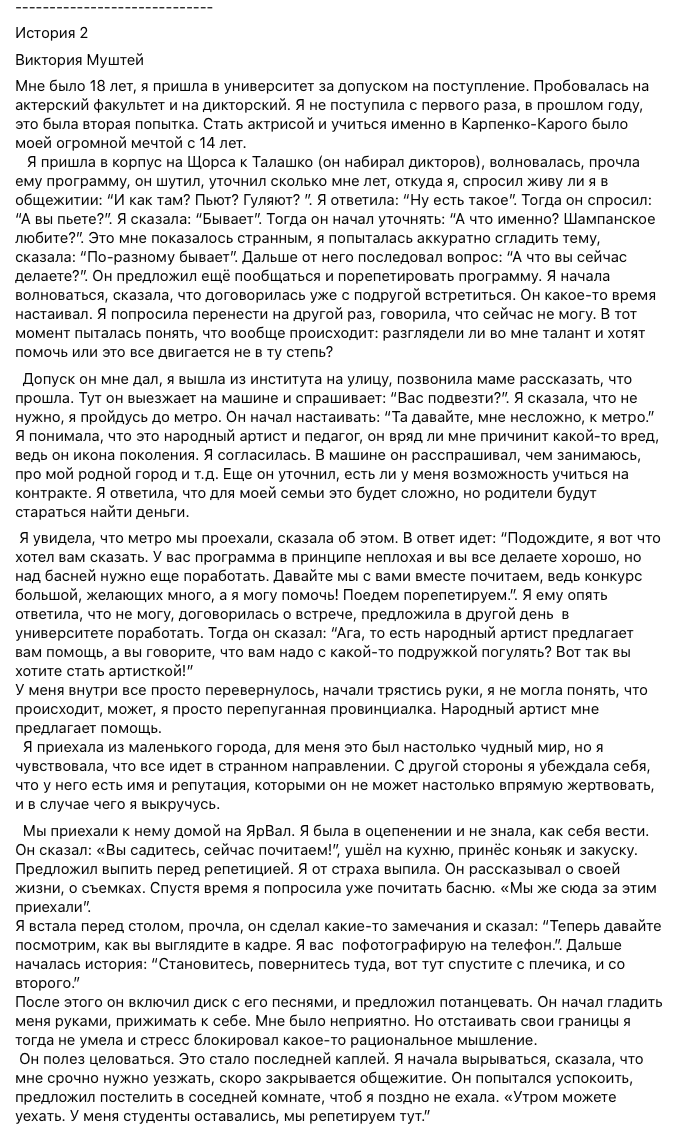 "В этом году Талашко собирался набрать новый курс, а ему уже 75 лет и его отклонения могут прогрессировать. Этому в основном подвержены абитуриентки – максимально незащищённые девочки, часто приезжие из других городов, у которых здесь нет семьи, друзей и поддержки. Я сначала хотела рассказать о домогательствах Талашко анонимно, но узнав историю Юлии Бирзул, с которой это произошло в 15 лет, я решила, что готова говорить об этом открыто. Потому что про какие-то анонимные истории очень легко сказать, что это выдумка. Хотя мне крайне не хотелось это подкреплять своим именем, потому что это неприятный пиар для меня и для моей семьи. Но факт того, что это продолжается до сих пор… Если я так легко отделалась, это не значит, что у других девушек получится", – отметила в комментарии "Стране" Виктория Муштей.