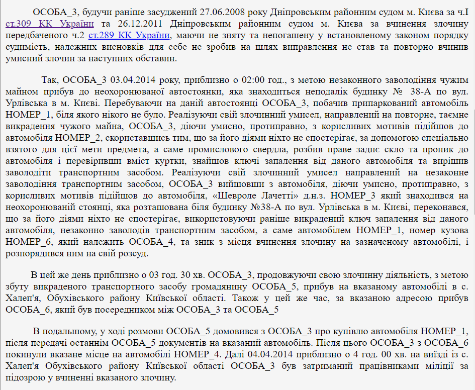 Затем Константин Резников дважды получал приговоры по ст.289 ч.2 УК Украниы за угон автомобиля. Первый приговор по этой статье был в 2011 году, второй в 2014 году, когда Константин Резников, разбив стекло, угнал со стоянки в Киеве автомобиль и пытался его продать. Данные факты приведены в приговоре Дарницкого райсуда Киева, по которому преступник был осужден на 6,5 лет: