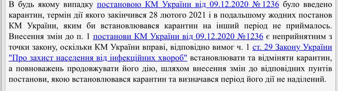 Но в это же время в Раде созрела идея расширить права Кабмина по продлению карантина и введению карантинных ограничений, чтоб решить проблему с исками на уровне закона.