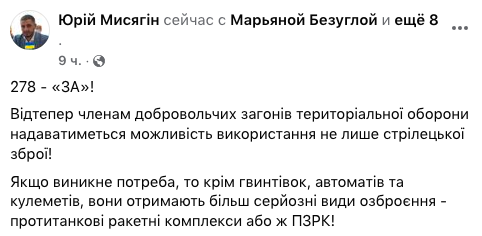 "Если возникнет необходимость, то кроме винтовок, автоматов и пулеметов, они получат более серьезные виды вооружения – противотанковые ракетные комплексы или ПЗРК", - написал он на своей странице в Facebook. "ПЗРК в кожну хату", - отреагировали на это подписчики депутата.