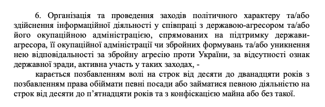 6. Организация и проведение мероприятий политического характера или осуществление информационной деятельности в сотрудничестве с РФ будет наказываться лишением свободы сроком от 10 до 12 лет (с лишением права занимать определенные должности сроком до 15 лет).