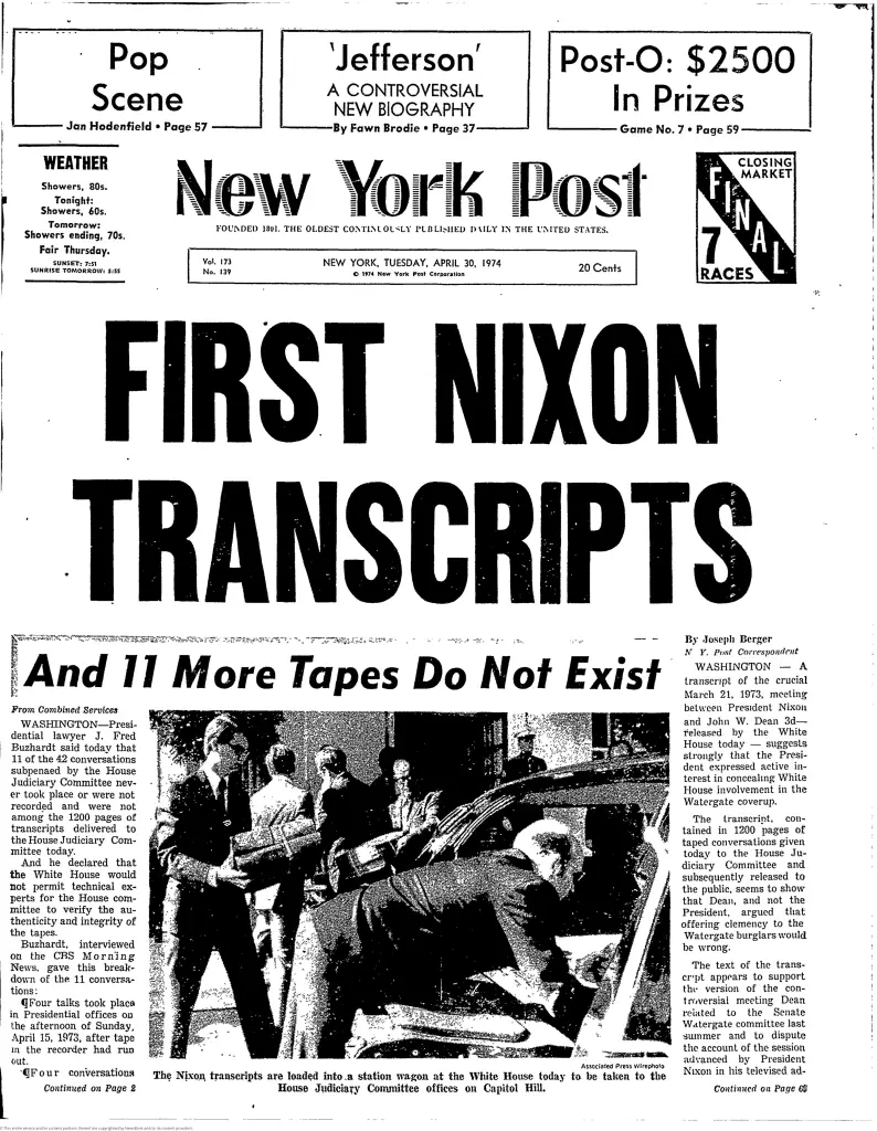 "Нью-Йорк Пост", 30 апреля 1974. Никсон отдал записи