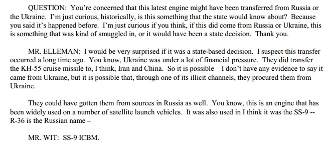 Эллман не смог исключить возможность того, что крупное российское ракетное предприятие "Энергомаш", тесно связанное с украинским комплексом, сыграло свою роль в передаче технологии двигателей РД-250 Северной Корее.