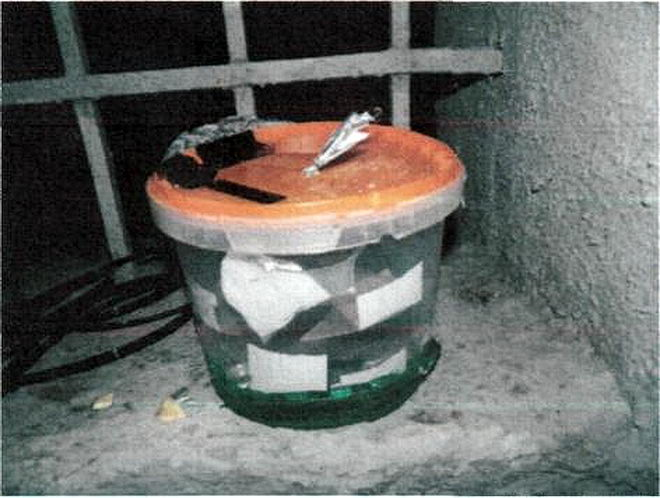 Под контролем представительского начальства специалисты установили, что "находка" офцера УГО представляла собой прозрачное ведро с крышкой емкостью 4 литра, обмотанное скотчем. Оно было присоединено к пруту ограды пластиковыми хомутами длиной 50 см черного цвета. На хомутах была видна маркировка S-28 и S-26. Взрывотехники установили содержимое ведра: 14 болтов и 120 хромированных гаек, 5 электродетонаторов, 4 гранаты РГД-5 и одна Ф-1, на которых были затерты серийные номера.