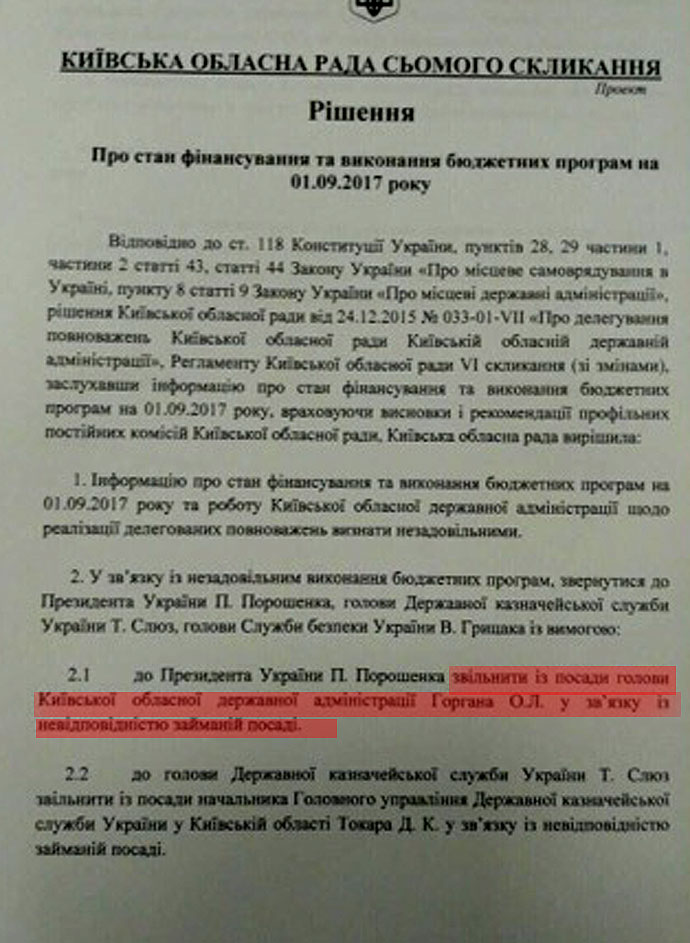 Губернатора Киевщины Александра Горгана народные избранники потребовали уволить с должности.