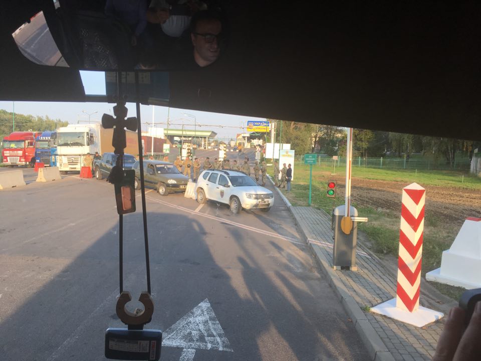 Саакашвили и компания подъехали на автобусе к украинской границе, где были остановлены рядами спецназа. Дорогу также перегородили автомобилями: